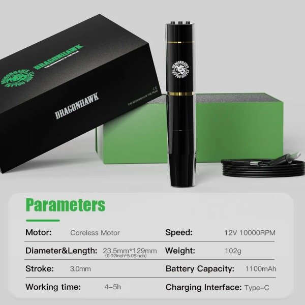 Invierta en un sistema de tatuaje completo. La Dragonhawk WQP-208 garantiza seguridad e higiene con su diseño fácil de limpiar y compatibilidad con cartuchos estándar.